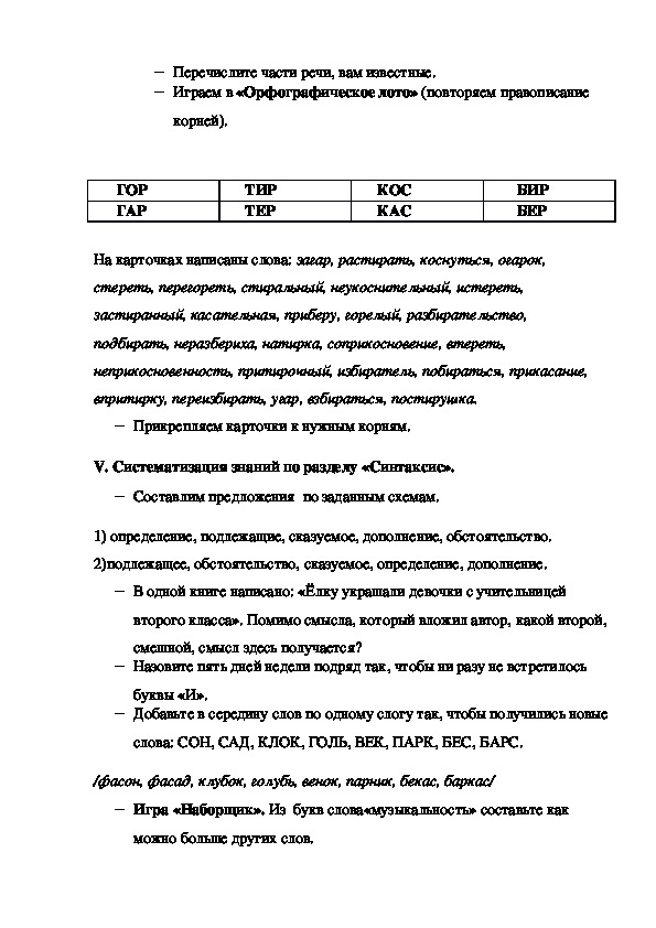 В ходе занятия проводится систематизация и повторение изученного по всем основным разделам курса ("Лексика", "Фонетика", "Морфология", "Синтаксис"). Задания предлагаются в игровой форме.