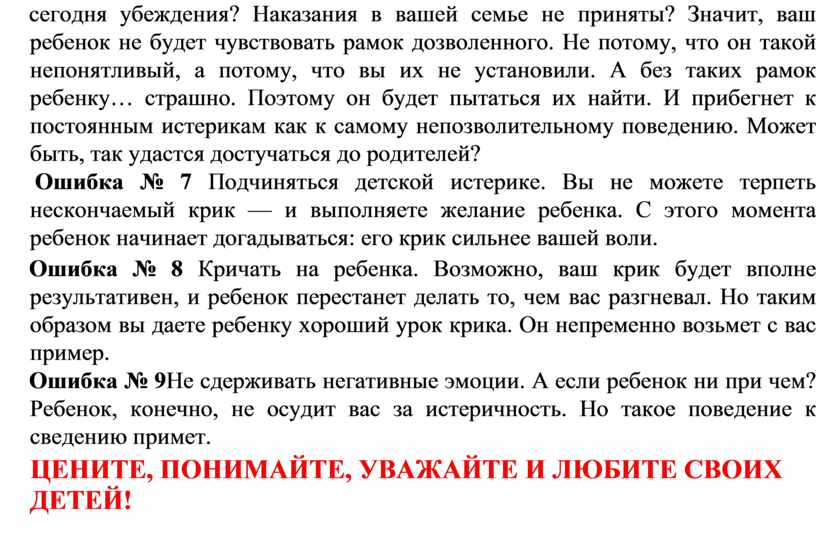 Ошибка № 6 Не наказывать ребенка. Разве можно наказывать ребенка?! Это жестокость, признак родительской слабости и пережиток прошлого! Хотите наказать — наказывайте равного себе взрослого, а не беззащитного ребенка. Максимум, что родители могут позволить себе по отношению к ребенку, — это показать ему свое недовольство. Вам близки эти распространенные сегодня убеждения? Наказания в вашей семье не приняты? Значит, ваш ребенок не будет чувствовать рамок дозволенного. Не потому, что он такой непонятливый, а потому, что вы их не установили. А без таких рамок ребенку… страшно. Поэтому он будет пытаться их найти. И прибегнет к постоянным истерикам как к самому непозволительному поведению. Может быть, так удастся достучаться до родителей?