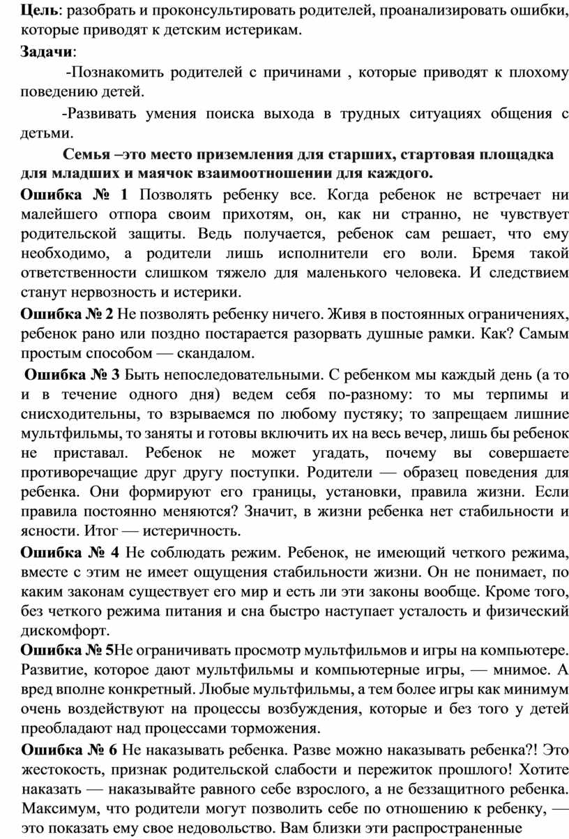 Цель: разобрать и проконсультировать родителей, проанализировать ошибки, которые приводят к детским истерикам.