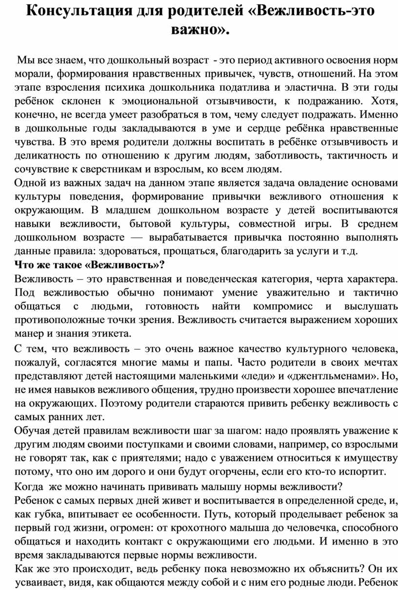 Консультация для родителей «Вежливость-это важно».