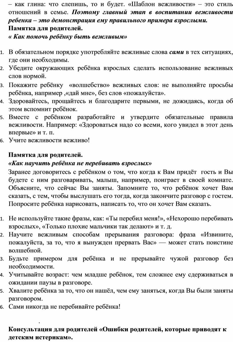 Консультация для родителей «Ошибки родителей, которые приводят к детским истерикам».