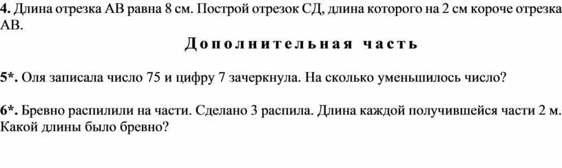 4. Длина отрезка АВ равна 8 см. Построй отрезок СД, длина которого на 2 см короче отрезка АВ.