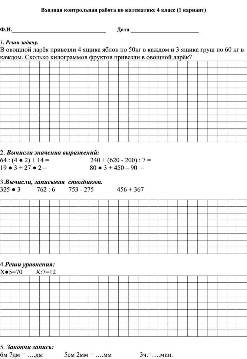Входная контрольная работа по математике 4 класс (1 вариант)