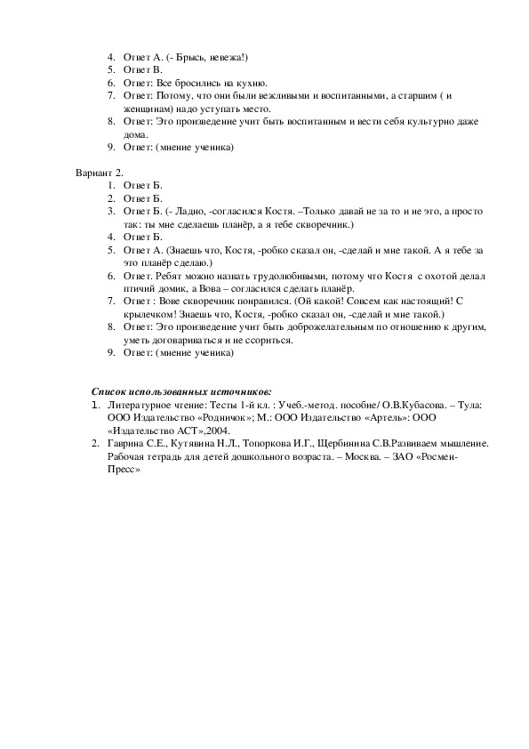 1. Литературное чтение: Тесты 1й кл. : Учеб.метод. пособие/ О.В.Кубасова. – Тула:
