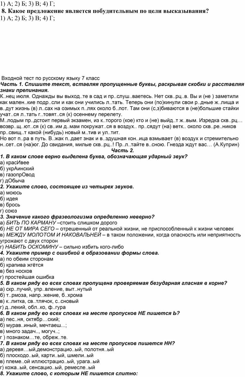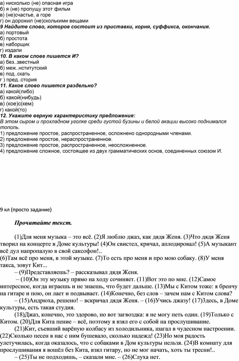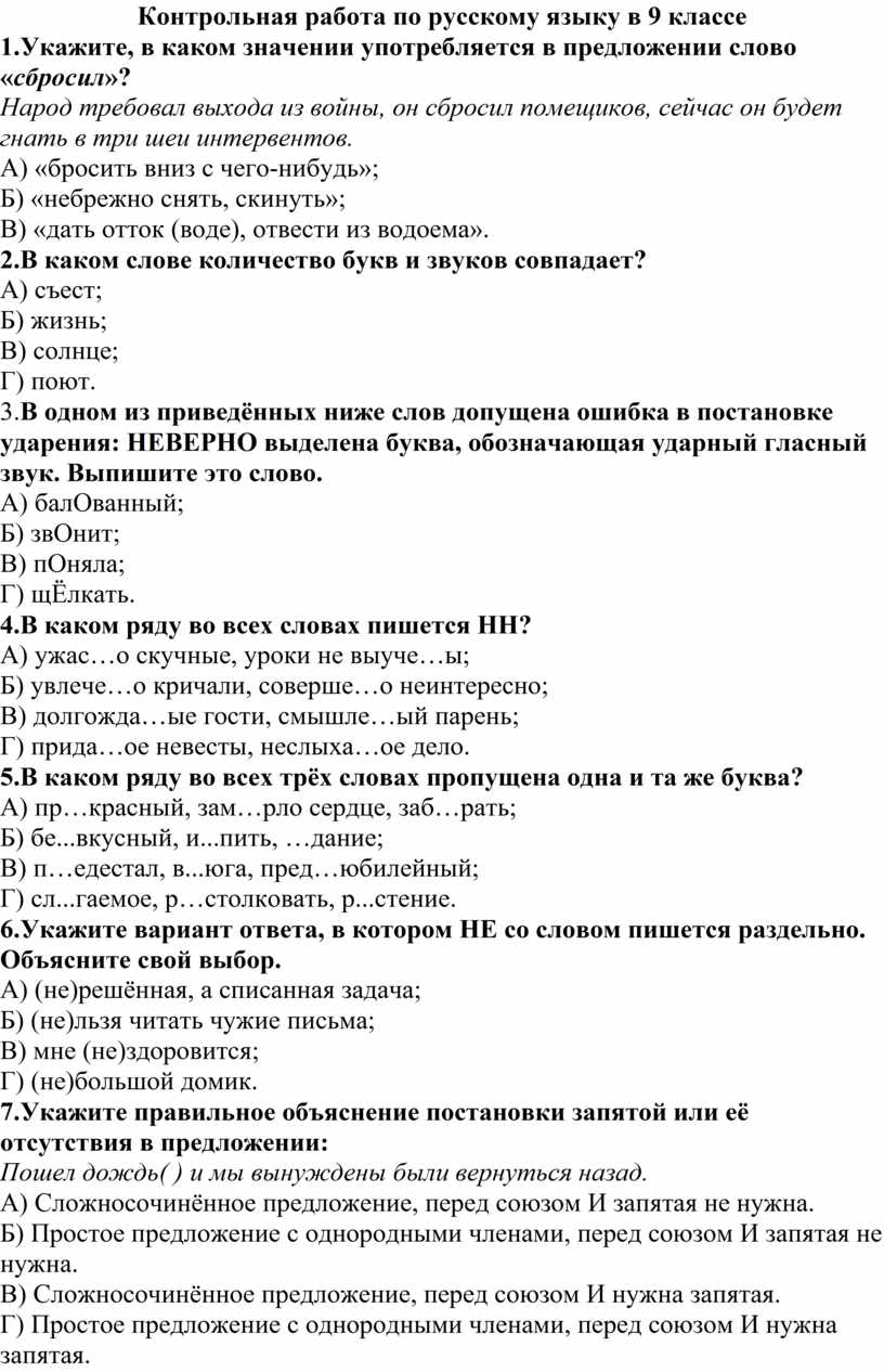 Контрольная работа по русскому языку в 9 классе