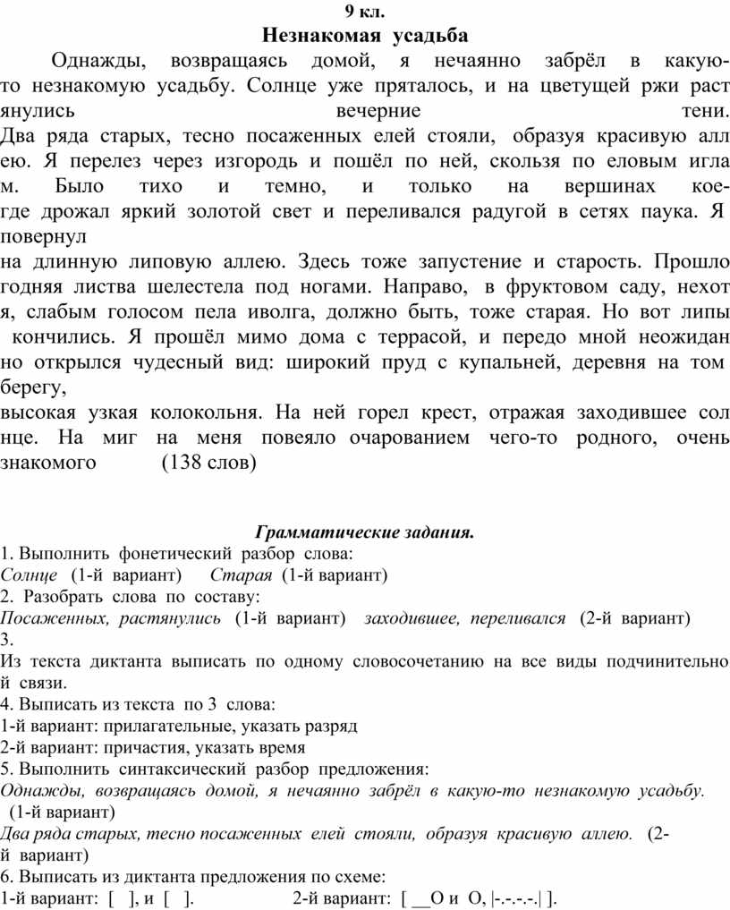 Однажды, возвращаясь домой, я нечаянно забрёл в какую-то незнакомую усадьбу. Солнце уже пряталось, и на цветущей ржи растянулись вечерние тени. Два ряда старых, тесно посаженных елей стояли, образуя красивую аллею. Я перелез через изгородь и пошёл по ней, скользя по еловым иглам. Было тихо и темно, и только на вершинах кое-где дрожал яркий золотой свет и переливался радугой в сетях паука. Я повернул на длинную липовую аллею. Здесь тоже запустение и старость. Прошлогодняя листва шелестела под ногами. Направо, в фруктовом саду, нехотя, слабым голосом пела иволга, должно быть, тоже старая. Но вот липы кончились. Я прошёл мимо дома с террасой, и передо мной неожиданно открылся чудесный вид: широкий пруд с купальней, деревня на том берегу, высокая узкая колокольня. На ней горел крест, отражая заходившее солнце. На миг на меня повеяло очарованием чего-то родного, очень знакомого (138 слов)