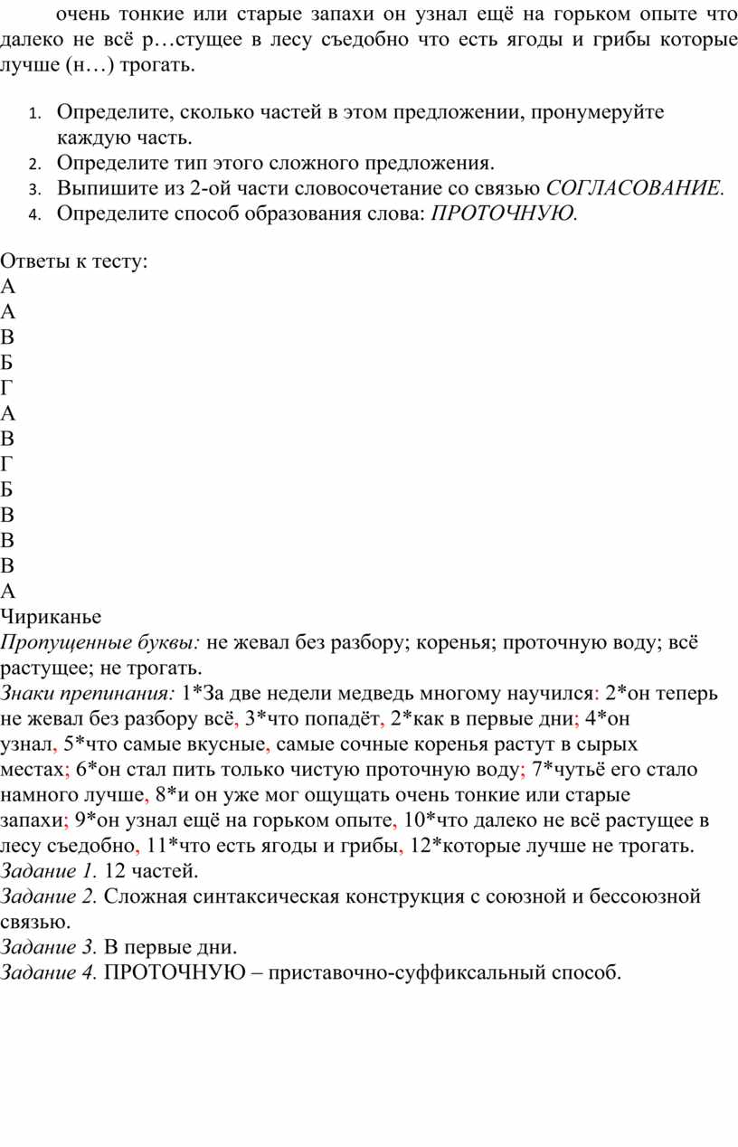 За две недели медведь многому научился он теперь (н…) жевал без ра…бору всё что попадёт как в первые дни он узнал что самые вкусные сочные к…ренья растут в сырых местах он стал пить только чистую пр…точную воду чутьё его стало намного лучше и он уже мог ощущать очень тонкие или старые запахи он узнал ещё на горьком опыте что далеко не всё р…стущее в лесу съедобно что есть ягоды и грибы которые лучше (н…) трогать.