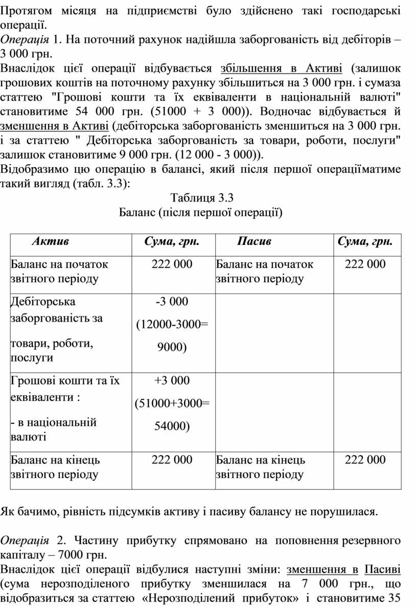 Відобразимо цю операцію в балансі, який після першої операції матиме такий вигляд (табл. 3.3):
