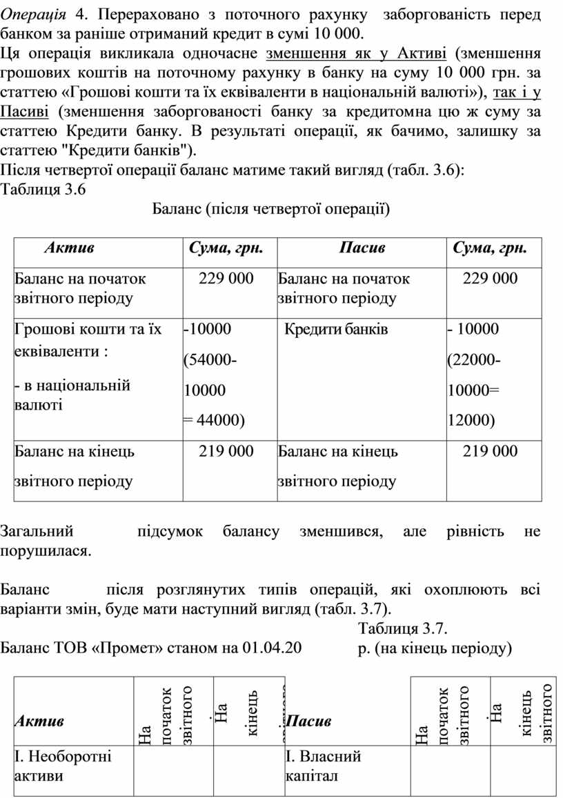 Баланс після розглянутих типів операцій, які охоплюють всі варіанти змін, буде мати наступний вигляд (табл. 3.7).