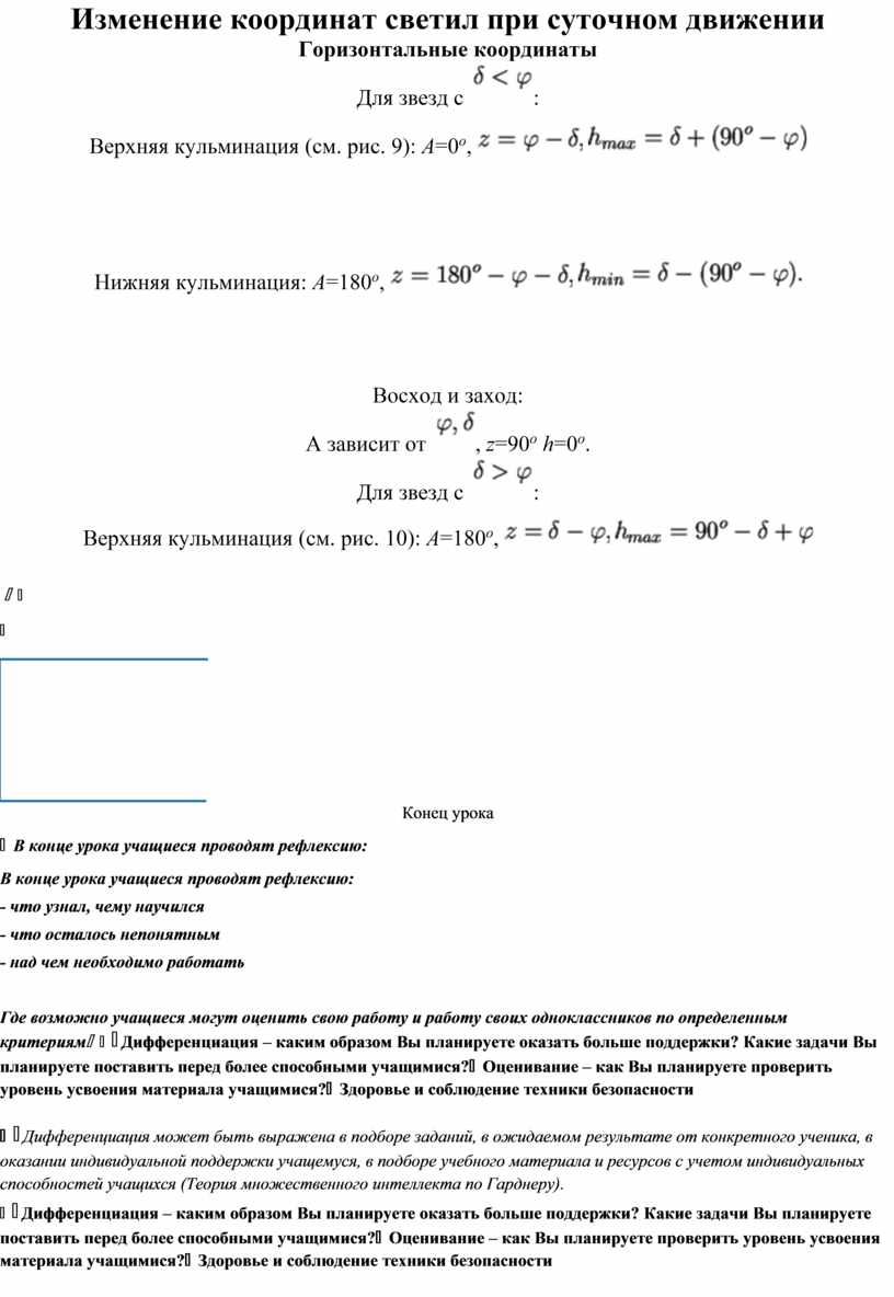 светила к той или иной группе определяется его склонением Изменение координат светил при суточном движении Горизонтальные координаты Для звезд с Верхняя кульминация (см. рис. 9): A=0o,