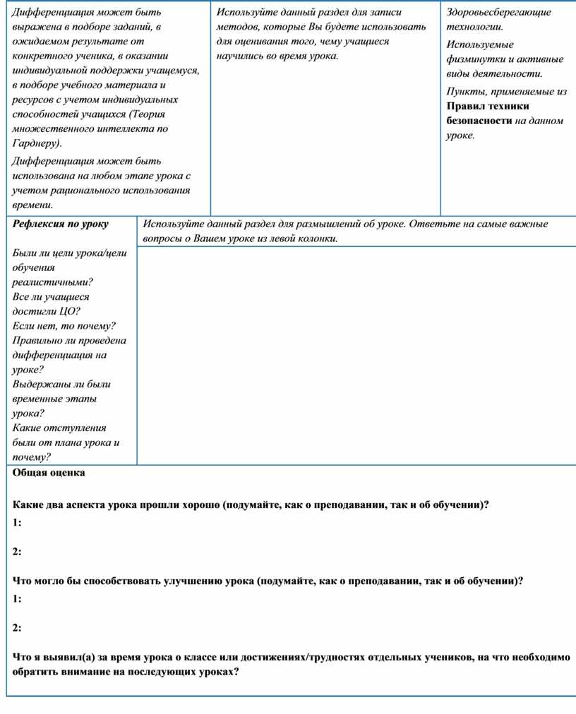 Используйте данный раздел для размышлений об уроке. Ответьте на самые важные вопросы о Вашем уроке из левой колонки. |