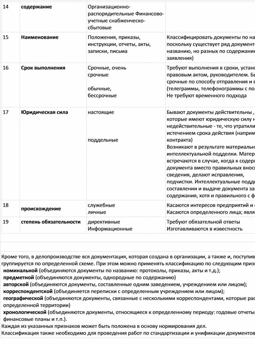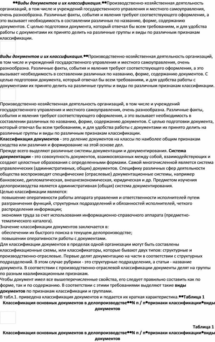Производственно-хозяйственная деятельность организаций, в том числе и учреждений государственного управления и местного самоуправления, очень разнообразна. Различные факты, события и явления требуют соответствующего оформления, а это вызывает необходимость в составлении различных по названию, форме, содержанию документов. С целью подготовки документа, который отвечал бы всем требованиям, и для удобства работы с документами их принято делить на различные группы и виды по различным признакам классификации. Классификация документов - это деление документов на классы по наиболее общим признакам сходства или различия и формирование на этой основе дел. Прежде всего выделяют различные системы документации и документирования. Система документации - это совокупность документов, взаимосвязанных между собой, взаимодействующих и создают целостные образования с определенными формами. Самой многочисленной является система управленческих (административных, общих) документов. Специфику различных сфер деятельности общества воспроизводят специфические (отраслевые) документационные системы, например банковские, дипломатическая, внешнеэкономическая, юридическая и др. Предметом изучения делопроизводства является административная (общая) система документирования. Целью классификации являются: · повышение оперативности работы аппарата управления и ответственности исполнителей путем разграничения функций, структурных подразделений и обязанностей исполнителей, четкого распределения информации; · экономия труда за счет использования информационно-справочного аппарата (предметно-тематического каталога). Значение классификации документов заключается в: · обеспечении их быстрого поиска в текущем делопроизводстве; · повышении оперативности работы с документами. Для классификации документов в пределах одной организации могут быть составлены классификационные схемы, или классификаторы, которые бывают двух типов: структурные и производственно-отраслевые. Первые делят документацию на части в соответствии с структурных подразделений. В этом случае рубрики - это структурные подразделения, а статьи - название документа. В соответствии с производственно-отраслевой классификации документы делят на группы по разным квалификационным признакам. Чтобы документ имел все вышеперечисленные свойства, его следует правильно составить как по форме, так и по содержанию. В соответствии с этими требованиями выделяют такие виды документов по признакам классификации и группами. В табл.1. приведена классификация документов и подается их краткая характеристика. |