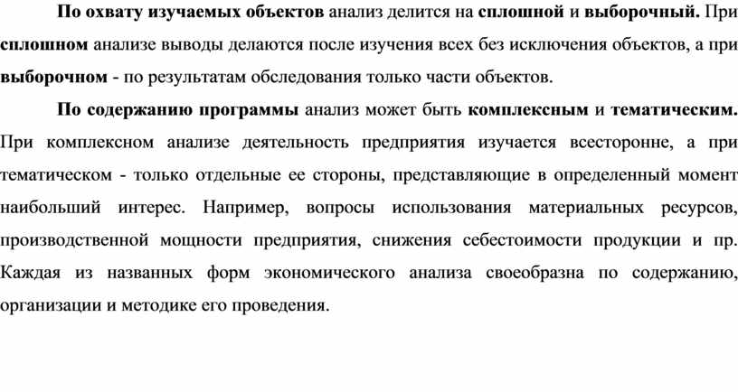 По охвату изучаемых объектов анализ делится на сплошной и выборочный. При сплошном анализе выводы делаются после изучения всех без исключения объектов, а при выборочном - по результатам обследования только части объектов.