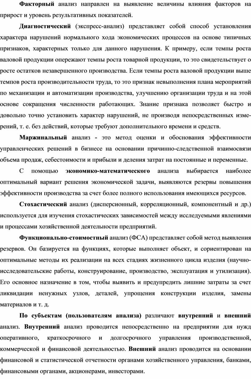По методике изучения объектов анализ может быть сравнительным, диагностическим, маржинальным, факторным, экономико-математическим, экономико-статистическим функционально-стоимостным и т.д.