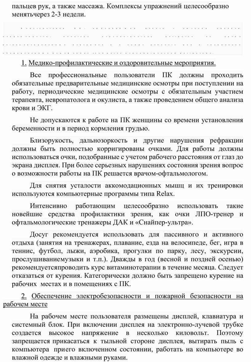 Все профессиональные пользователи ПК должны проходить обязательные предварительные медицинские осмотры при поступлении на работу, периодические медицинские осмотры с обязательным участием терапевта, невропатолога и окулиста, а также проведением общего анализа крови и ЭКГ.