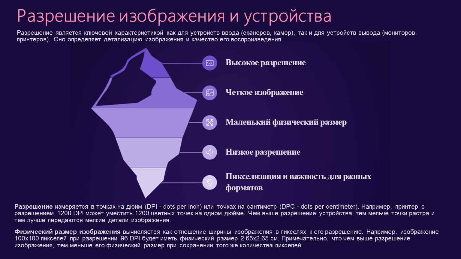 Показывает количество точек (пикселей) на единицу длины, обычно измеряется в точках на дюйм (DPI - dots per inch). Более высокое разрешение означает более мелкие пиксели и, как следствие, лучшую детализацию.