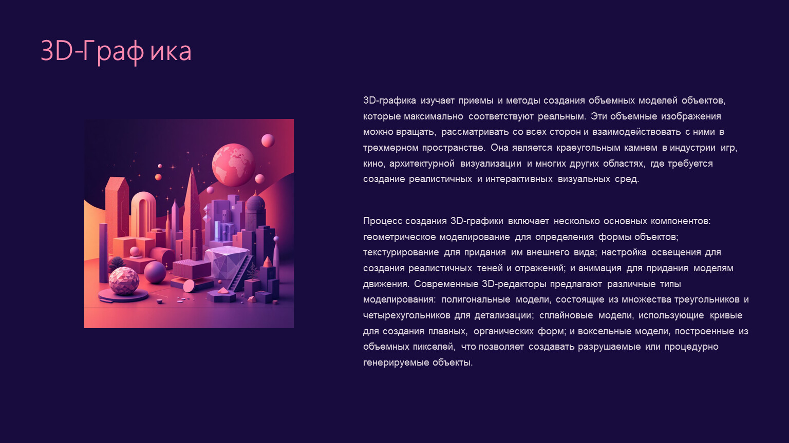 3D-графика изучает приемы и методы создания объемных моделей объектов, которые максимально соответствуют реальным. Эти объемные изображения можно вращать, рассматривать со всех сторон и взаимодействовать с ними в трехмерном пространстве. Она является краеугольным камнем в индустрии игр, кино, архитектурной визуализации и многих других областях, где требуется создание реалистичных и интерактивных визуальных сред.