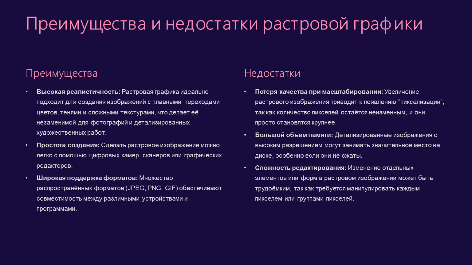 Потеря качества при масштабировании: Увеличение растрового изображения приводит к появлению "пикселизации", так как количество пикселей остаётся неизменным, и они просто становятся крупнее.