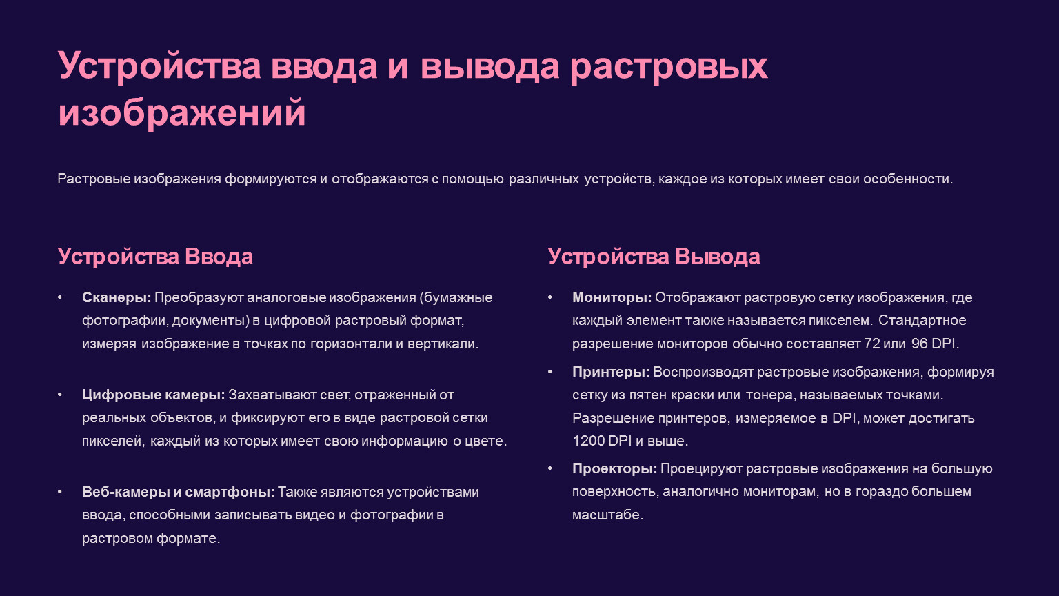 Растровые изображения формируются и отображаются с помощью различных устройств, каждое из которых имеет свои особенности.