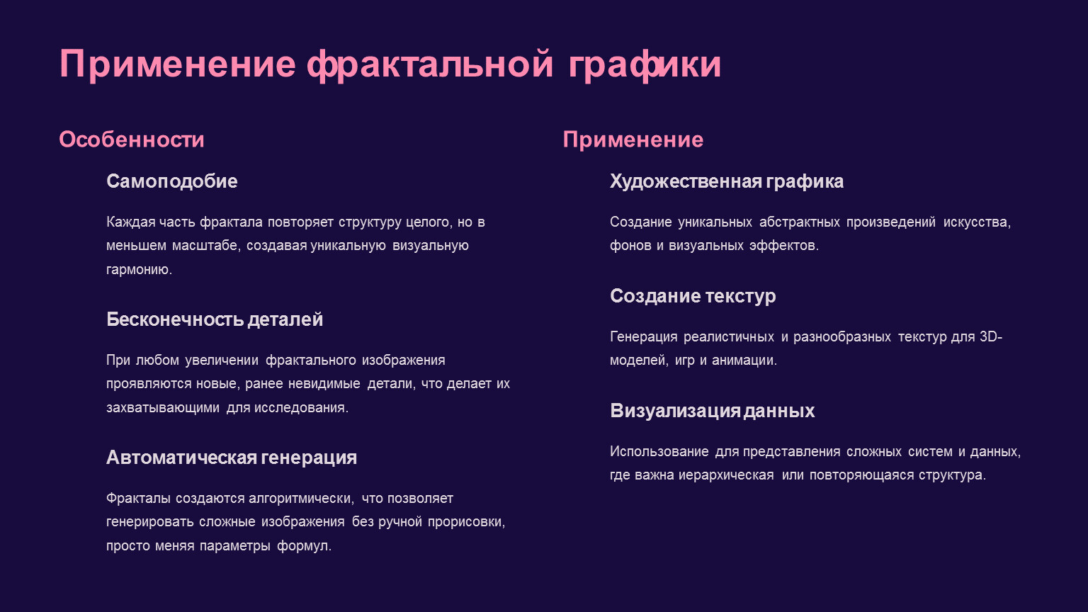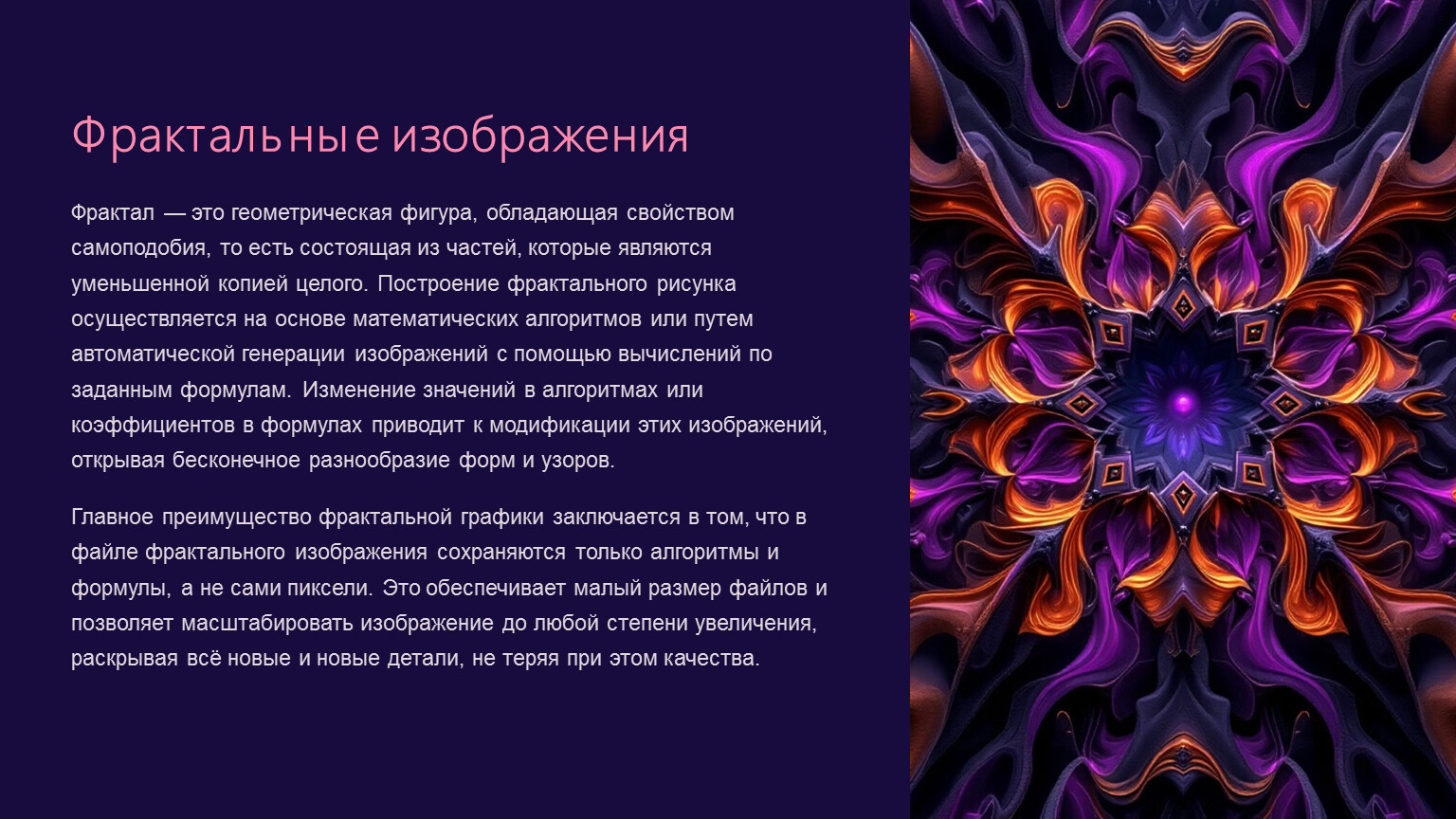 Фрактал — это геометрическая фигура, обладающая свойством самоподобия, то есть состоящая из частей, которые являются уменьшенной копией целого. Построение фрактального рисунка осуществляется на основе математических алгоритмов или путем автоматической генерации изображений с помощью вычислений по заданным формулам. Изменение значений в алгоритмах или коэффициентов в формулах приводит к модификации этих изображений, открывая бесконечное разнообразие форм и узоров.