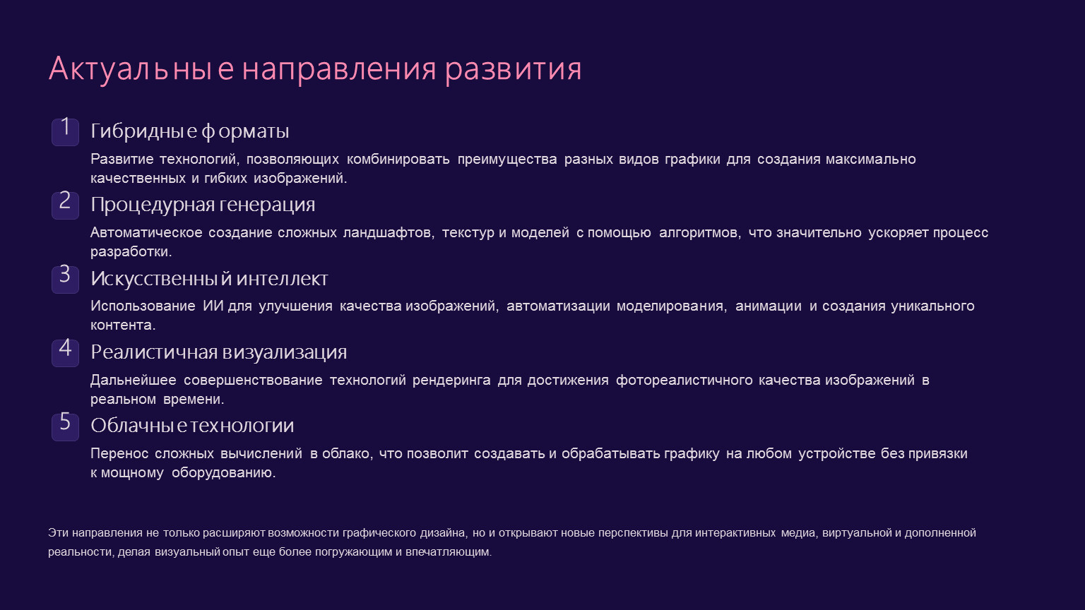 Эти направления не только расширяют возможности графического дизайна, но и открывают новые перспективы для интерактивных медиа, виртуальной и дополненной реальности, делая визуальный опыт еще более погружающим и впечатляющим.