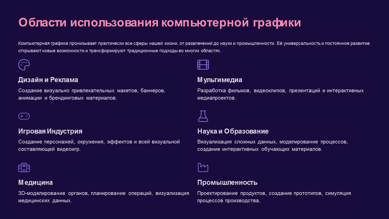Компьютерная графика пронизывает практически все сферы нашей жизни, от развлечений до науки и промышленности. Её универсальность и постоянное развитие открывают новые возможности и трансформируют традиционные подходы во многих областях.