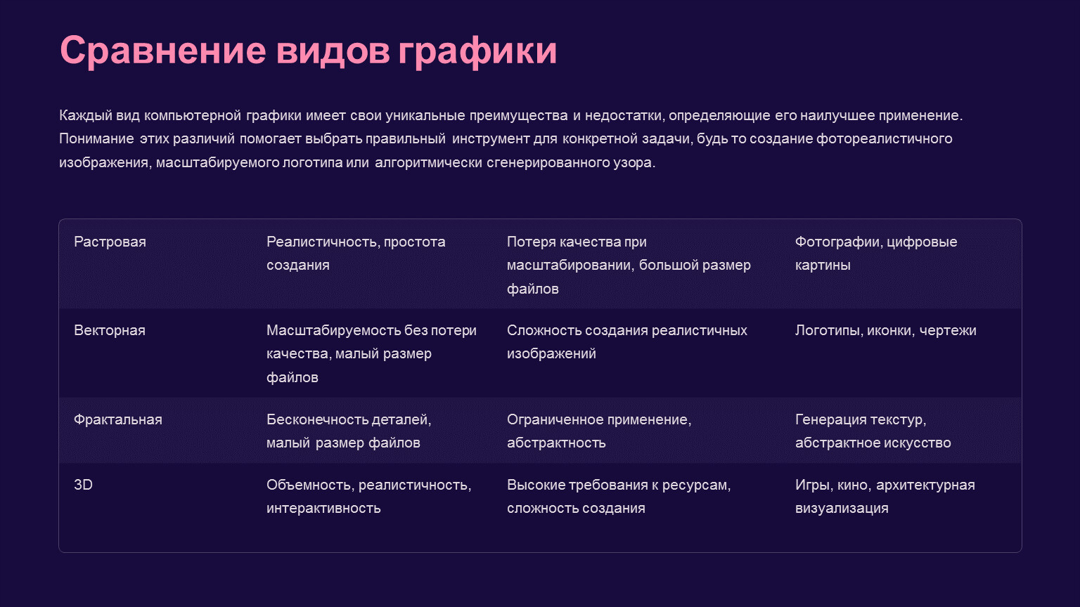Каждый вид компьютерной графики имеет свои уникальные преимущества и недостатки, определяющие его наилучшее применение. Понимание этих различий помогает выбрать правильный инструмент для конкретной задачи, будь то создание фотореалистичного изображения, масштабируемого логотипа или алгоритмически сгенерированного узора.