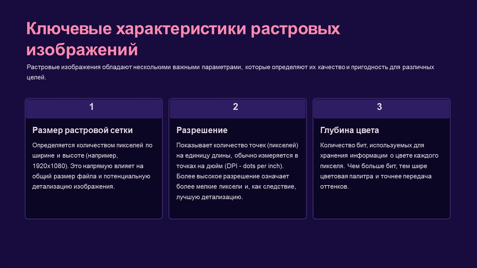 Растровые изображения обладают несколькими важными параметрами, которые определяют их качество и пригодность для различных целей.