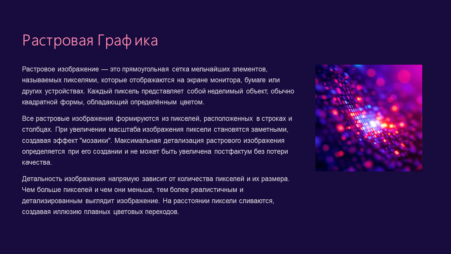 Все растровые изображения формируются из пикселей, расположенных в строках и столбцах. При увеличении масштаба изображения пиксели становятся заметными, создавая эффект "мозаики". Максимальная детализация растрового изображения определяется при его создании и не может быть увеличена постфактум без потери качества.