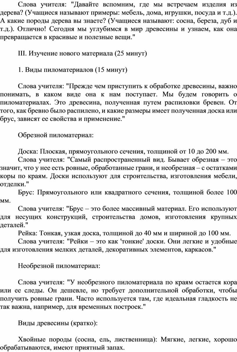 Слова учителя: "Давайте вспомним, где мы встречаем изделия из дерева? (Учащиеся называют примеры: мебель, дома, игрушки, посуда и т.д.). А какие породы дерева вы знаете? (Учащиеся называют: сосна, береза, дуб и т.д.). Отлично! Сегодня мы углубимся в мир древесины и узнаем, как она превращается в красивые и полезные вещи."