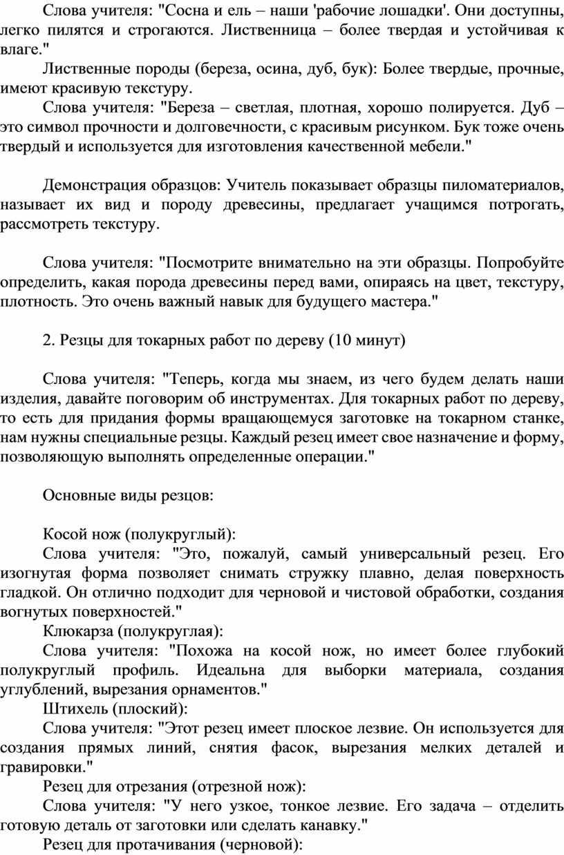 Слова учителя: "Теперь, когда мы знаем, из чего будем делать наши изделия, давайте поговорим об инструментах. Для токарных работ по дереву, то есть для придания формы вращающемуся заготовке на токарном станке, нам нужны специальные резцы. Каждый резец имеет свое назначение и форму, позволяющую выполнять определенные операции."