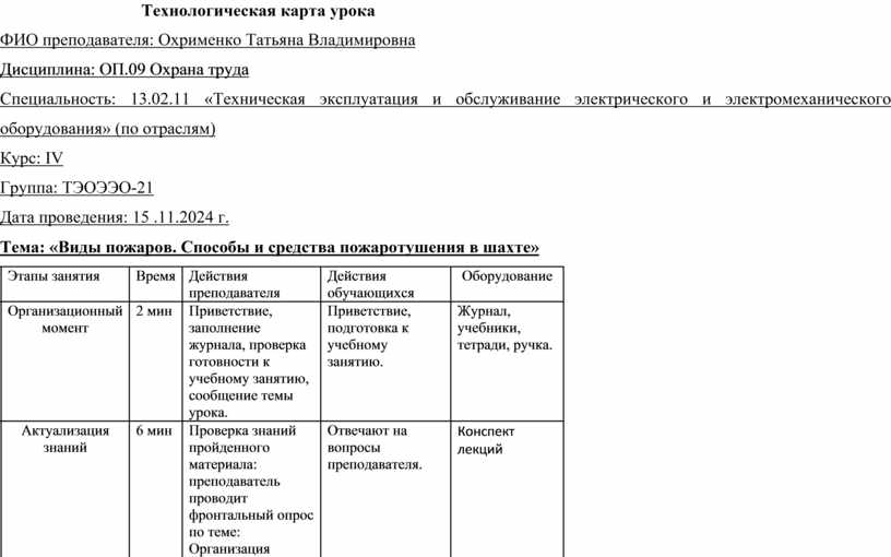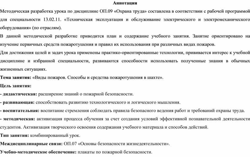 Методическая разработка урока по дисциплине ОП.09 «Охрана труда» составлена в соответствии с рабочей программой для специальности 13.02.11. «Техническая эксплуатация и обслуживание электрического и электромеханического оборудования» (по отраслям).