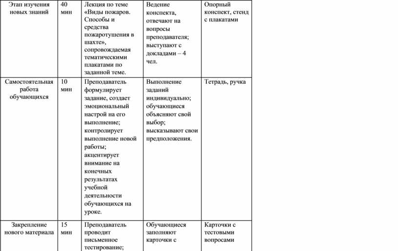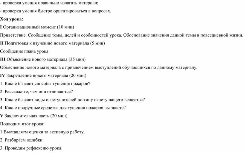 Проверка знаний пройденного материала: преподаватель проводит фронтальный опрос по теме: Организация противопожарной защиты. |
