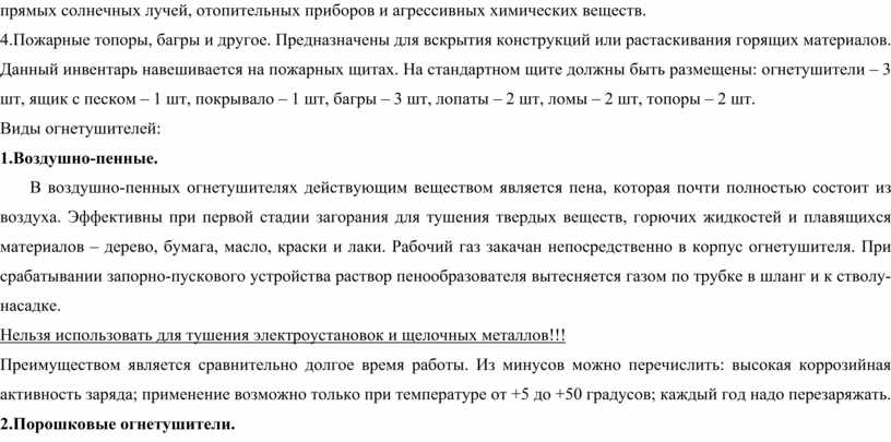 3.Огнетушители. Перед размещением на объекте должны обязательно пройти первичный осмотр лицом ответственным за пожарную безопасность на объекте. Огнетушители следует размещать в легкодоступных местах, а также вблизи мест потенциальных возгораний. При этом их необходимо беречь от прямых солнечных лучей, отопительных приборов и агрессивных химических веществ.