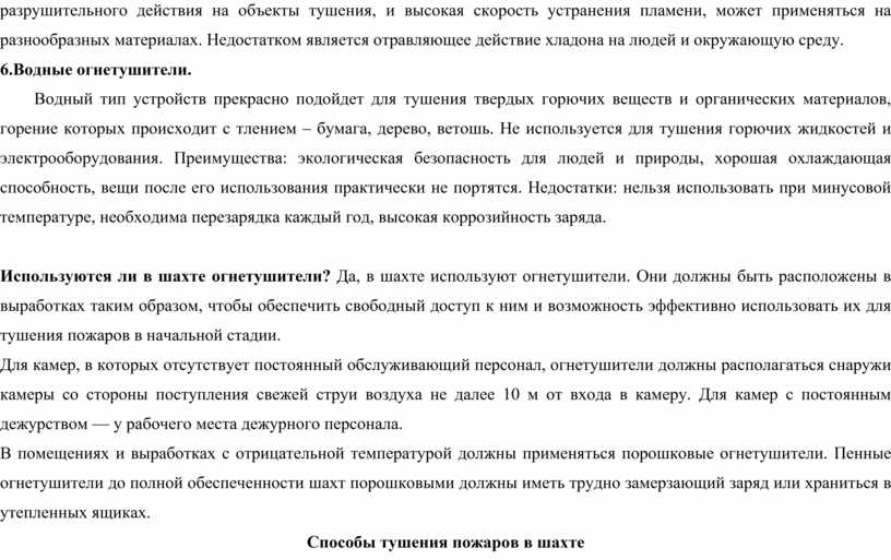 Используются ли в шахте огнетушители? Да, в шахте используют огнетушители. Они должны быть расположены в выработках таким образом, чтобы обеспечить свободный доступ к ним и возможность эффективно использовать их для тушения пожаров в начальной стадии.