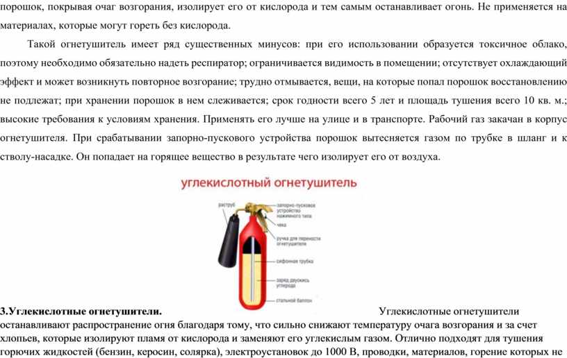 углекислота, попадая на зону горения, изолирует ее от кислорода.