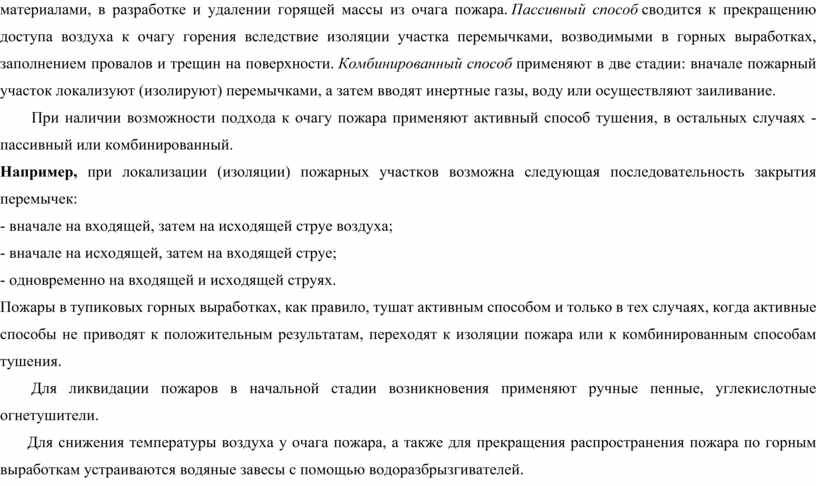 Существуют активный, пассивный и комбинированный способы тушения подземных пожаров. Активный способ заключается в непосредственном тушении пламени водой, огнетушителями, инертными материалами, в разработке и удалении горящей массы из очага пожара. Пассивный способ сводится к прекращению доступа воздуха к очагу горения вследствие изоляции участка перемычками, возводимыми в горных выработках, заполнением провалов и трещин на поверхности. Комбинированный способ применяют в две стадии: вначале пожарный участок локализуют (изолируют) перемычками, а затем вводят инертные газы, воду или осуществляют заиливание.