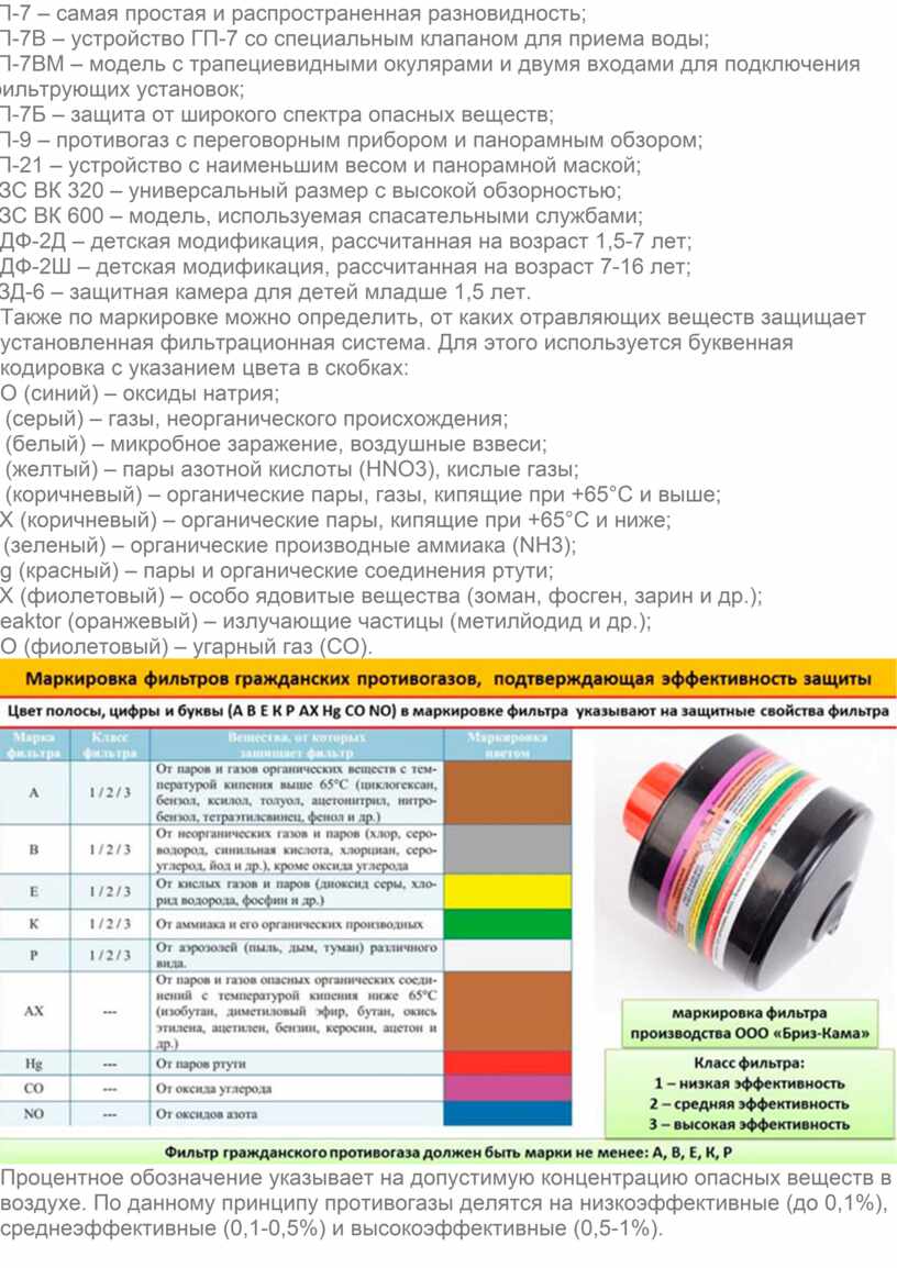 Также по маркировке можно определить, от каких отравляющих веществ защищает установленная фильтрационная система. Для этого используется буквенная кодировка с указанием цвета в скобках: