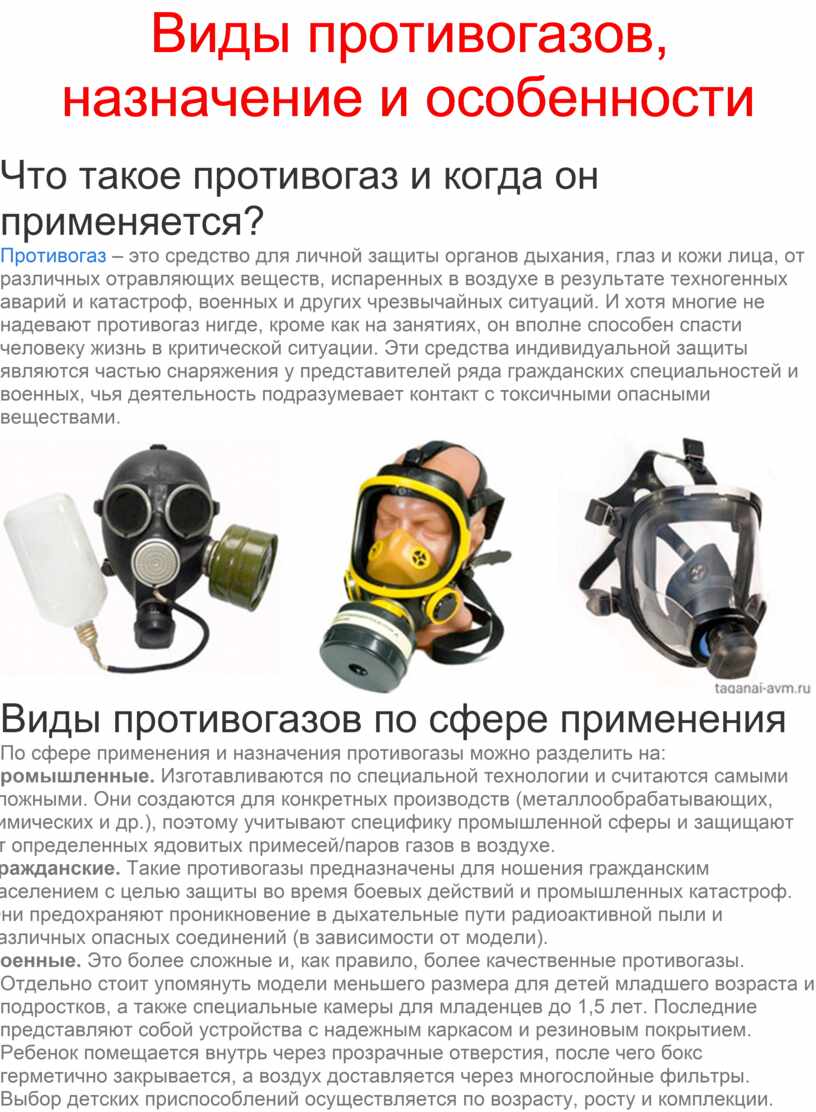 Противогаз – это средство для личной защиты органов дыхания, глаз и кожи лица, от различных отравляющих веществ, испаренных в воздухе в результате техногенных аварий и катастроф, военных и других чрезвычайных ситуаций. И хотя многие не надевают противогаз нигде, кроме как на занятиях, он вполне способен спасти человеку жизнь в критической ситуации. Эти средства индивидуальной защиты являются частью снаряжения у представителей ряда гражданских специальностей и военных, чья деятельность подразумевает контакт с токсичными опасными веществами.