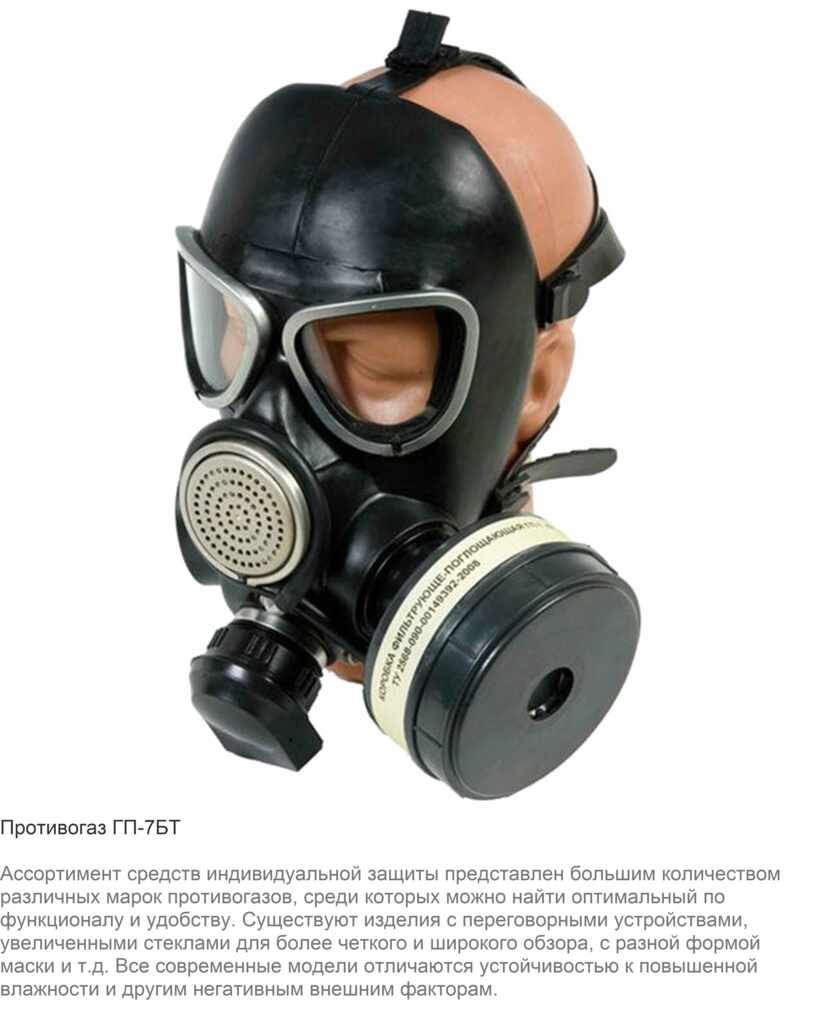 Ассортимент средств индивидуальной защиты представлен большим количеством различных марок противогазов, среди которых можно найти оптимальный по функционалу и удобству. Существуют изделия с переговорными устройствами, увеличенными стеклами для более четкого и широкого обзора, с разной формой маски и т.д. Все современные модели отличаются устойчивостью к повышенной влажности и другим негативным внешним факторам.