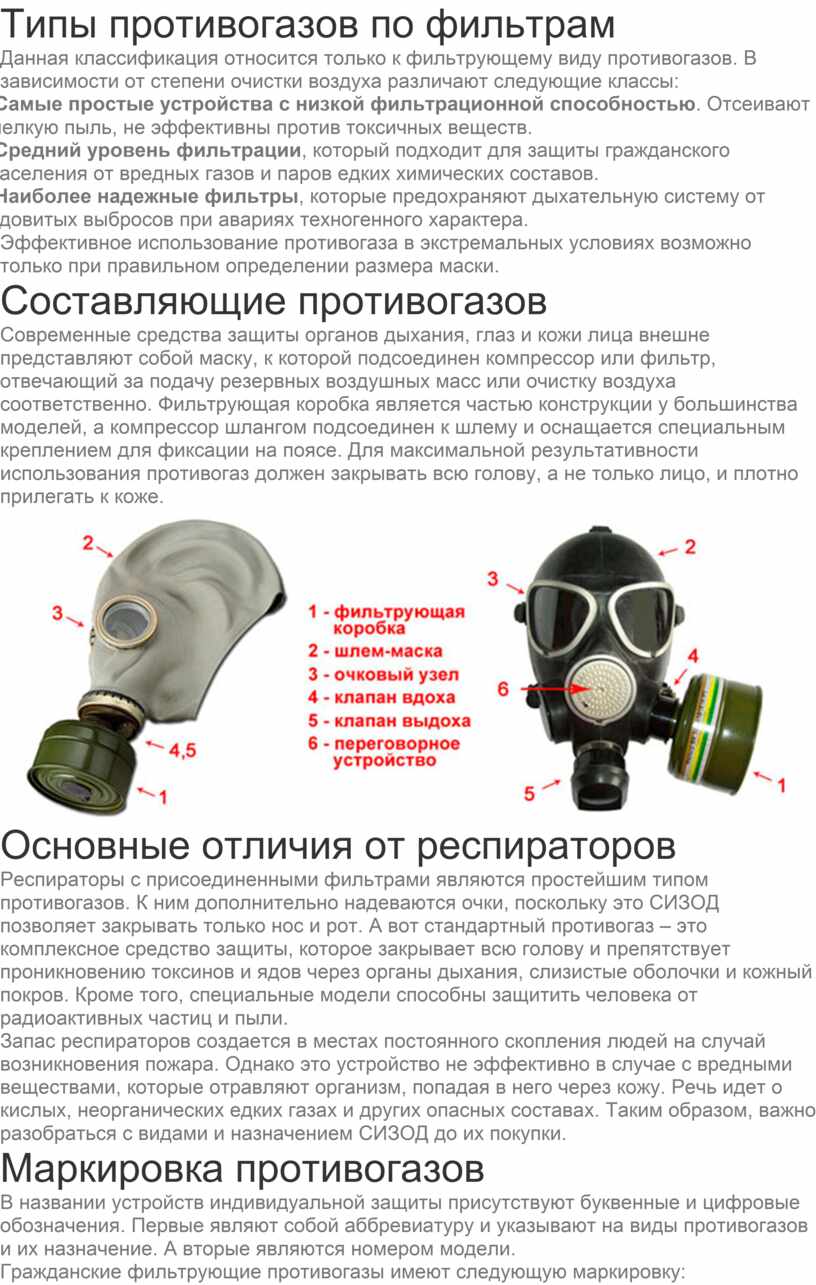Респираторы с присоединенными фильтрами являются простейшим типом противогазов. К ним дополнительно надеваются очки, поскольку это СИЗОД позволяет закрывать только нос и рот. А вот стандартный противогаз – это комплексное средство защиты, которое закрывает всю голову и препятствует проникновению токсинов и ядов через органы дыхания, слизистые оболочки и кожный покров. Кроме того, специальные модели способны защитить человека от радиоактивных частиц и пыли.
