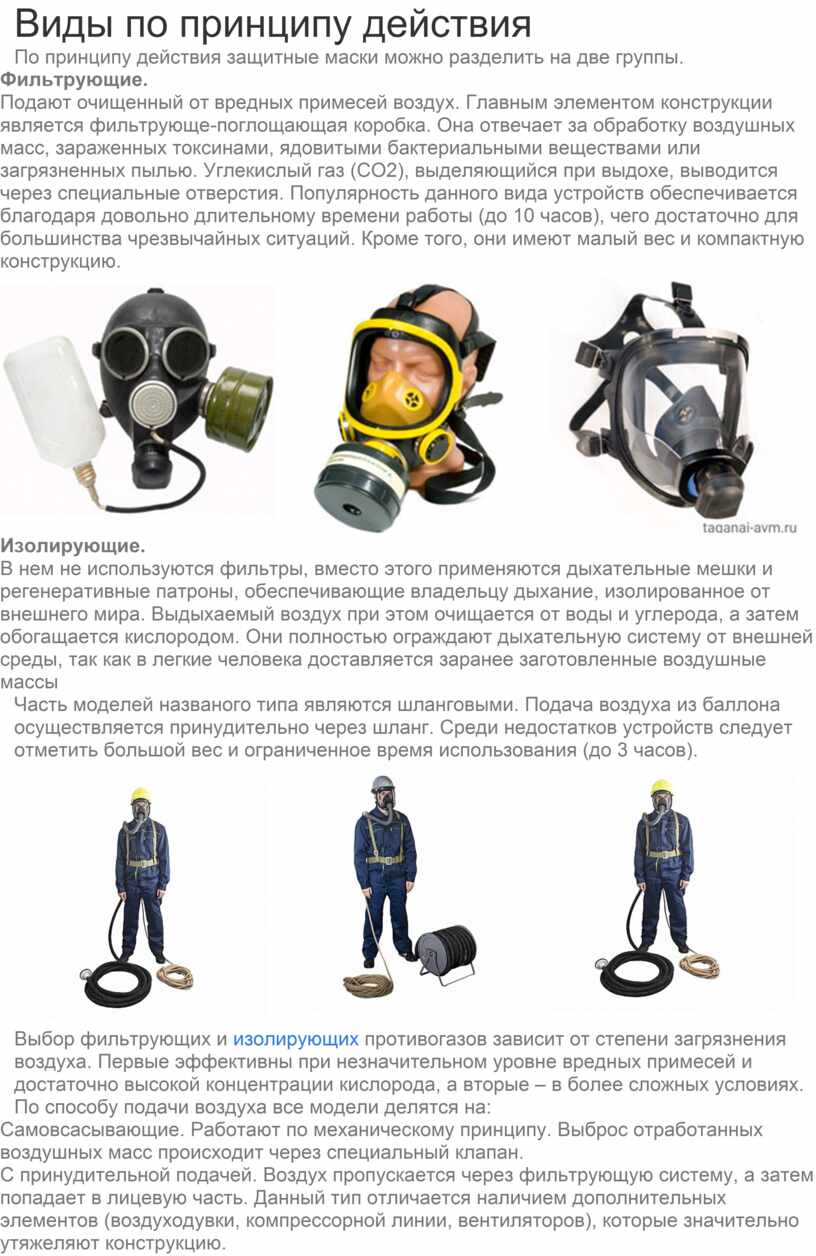 Выбор фильтрующих и изолирующих противогазов зависит от степени загрязнения воздуха. Первые эффективны при незначительном уровне вредных примесей и достаточно высокой концентрации кислорода, а вторые – в более сложных условиях.