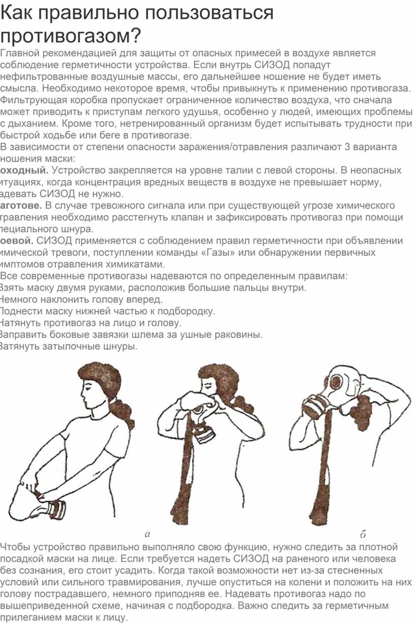 Главной рекомендацией для защиты от опасных примесей в воздухе является соблюдение герметичности устройства. Если внутрь СИЗОД попадут нефильтрованные воздушные массы, его дальнейшее ношение не будет иметь смысла. Необходимо некоторое время, чтобы привыкнуть к применению противогаза. Фильтрующая коробка пропускает ограниченное количество воздуха, что сначала может приводить к приступам легкого удушья, особенно у людей, имеющих проблемы с дыханием. Кроме того, нетренированный организм будет испытывать трудности при быстрой ходьбе или беге в противогазе.