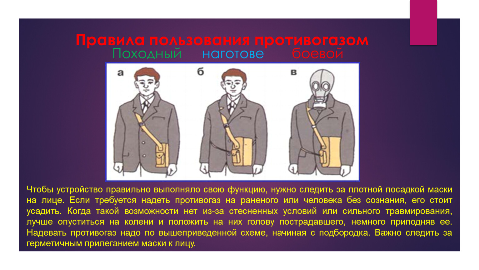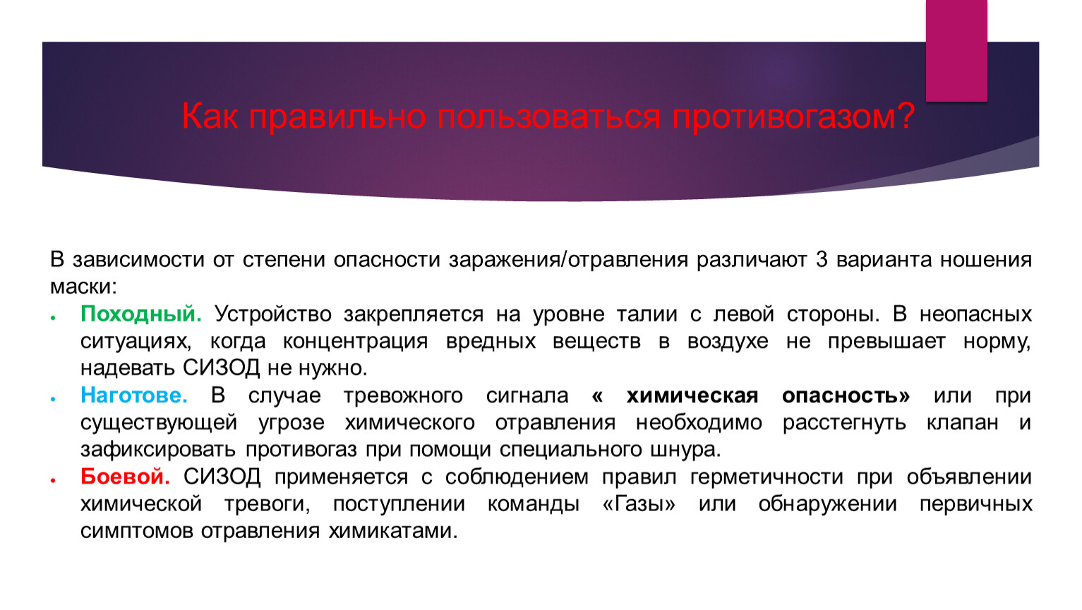 В зависимости от степени опасности заражения/отравления различают 3 варианта ношения маски: