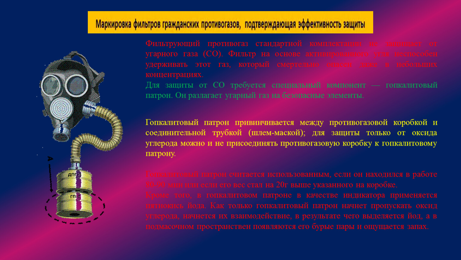 Кроме того, в гопкалитовом патроне в качестве индикатора применяется пятиокись йода. Как только гопкалитовый патрон начнет пропускать оксид углерода, начнется их взаимодействие, в результате чего выделяется йод, а в подмасочном пространствен появляются его бурые пары и ощущается запах.