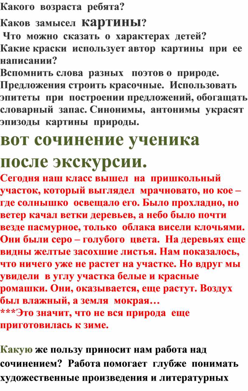 Работы различны по объему. Пишут работы в классе или дома. Научиться наблюдать и описывать природу можно на экскурсии, а также при чтении произведений, просмотров описания природы мастерами слова. Свои впечатления помогают писать сочинения по картине. При рассматривании картины « На пришкольном огороде», сначала идут вопросы: