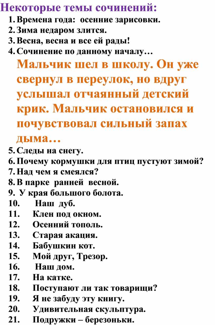 Мальчик шел в школу. Он уже свернул в переулок, но вдруг услышал отчаянный детский крик. Мальчик остановился и почувствовал сильный запах дыма…