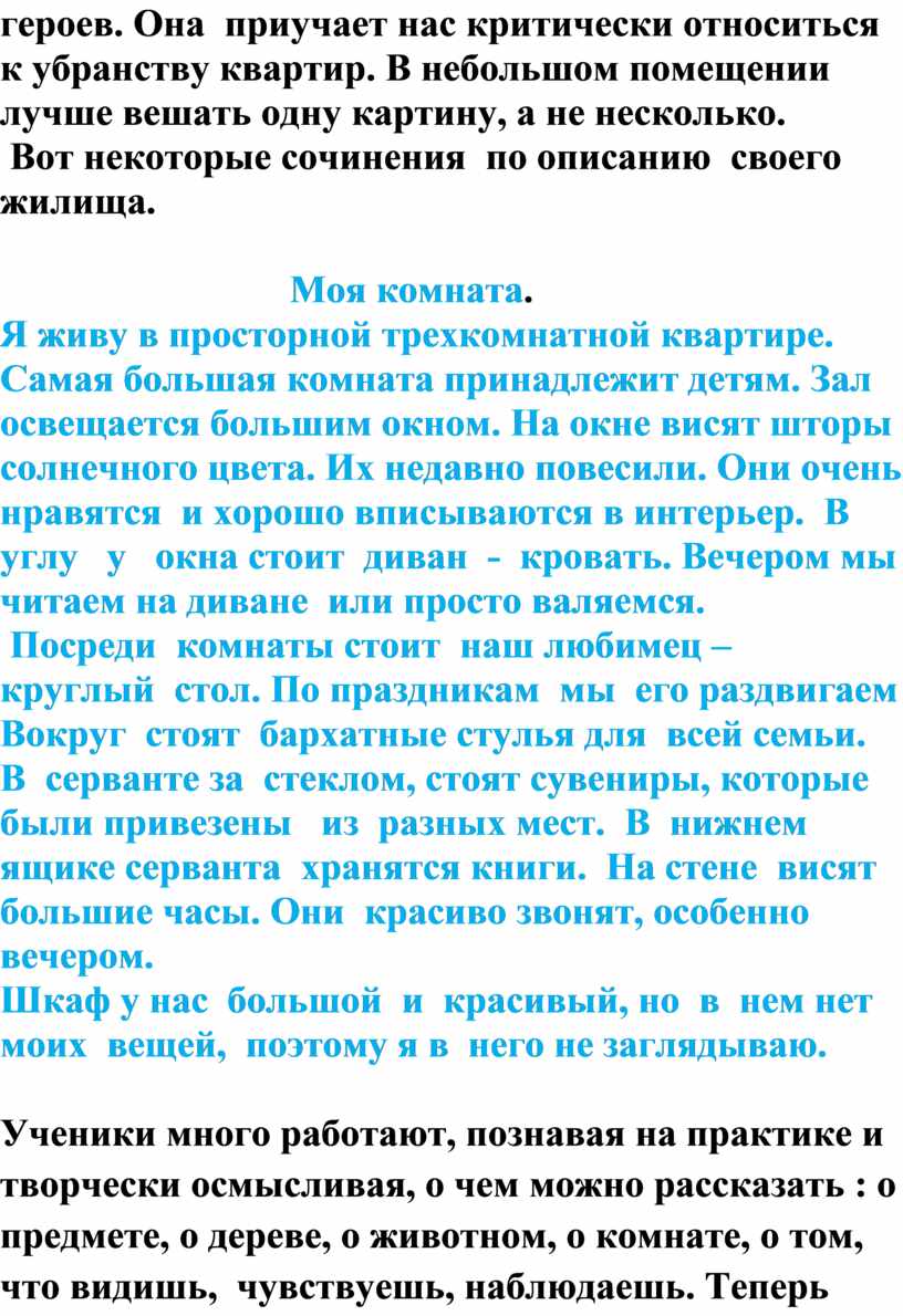 Какую же пользу приносит нам работа над сочинением? Работа помогает глубже понимать художественные произведения и литературных героев. Она приучает нас критически относиться к убранству квартир. В небольшом помещении лучше вешать одну картину, а не несколько.