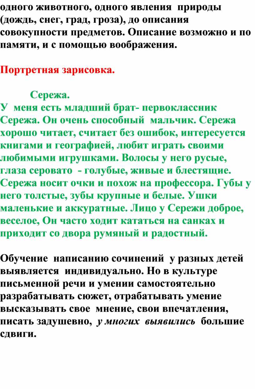 У меня есть младший брат- первоклассник Сережа. Он очень способный мальчик. Сережа хорошо читает, считает без ошибок, интересуется книгами и географией, любит играть своими любимыми игрушками. Волосы у него русые, глаза серовато - голубые, живые и блестящие. Сережа носит очки и похож на профессора. Губы у него толстые, зубы крупные и белые. Ушки маленькие и аккуратные. Лицо у Сережи доброе, веселое, Он часто ходит кататься на санках и приходит со двора румяный и радостный.