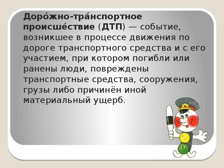 Доро́жно-тра́нспортное происше́ствие (ДТП) — событие, возникшее в процессе движения по дороге транспортного средства и с его участием, при котором погибли или ранены люди, повреждены транспортные средства, сооружения, грузы либо причинён иной материальный ущербПервое в истории зарегистрированное ДТП произошло 30 мая 1896 года в Нью-Йорке: Электромобиль Генри Уэлса столкнулся с велосипедом Эвелина Томаса, который отделался переломом ногиПервое в истории зарегистрированное ДТП произошло 30 мая 1896 года в Нью-Йорке: Электромобиль Генри Уэлса столкнулся с велосипедом Эвелина Томаса, который отделался переломом ноги